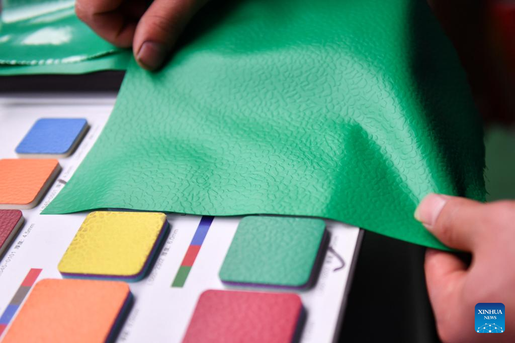 A worker checks the color consistency of roll flooring samples at a workshop in Guangyuan, southwest China's Sichuan Province, Dec. 12, 2025. The home furnishing industry of Guangyuan stands out for its high quality, and its roll flooring products sell well across China and overseas.