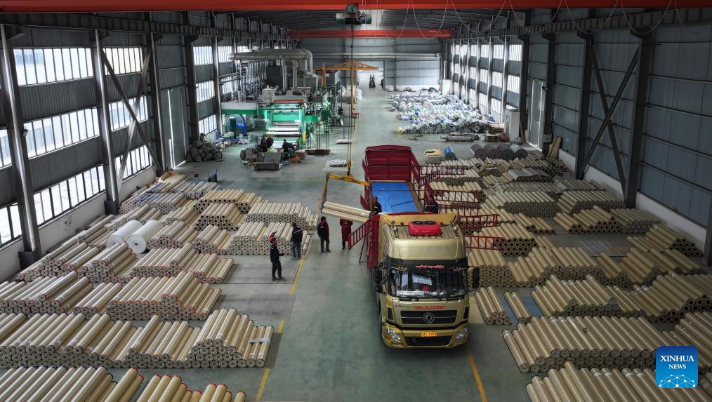 A drone photo taken on Dec. 12, 2025 shows dyes at a roll flooring manufacturing workshop in Guangyuan, southwest China's Sichuan Province. The home furnishing industry of Guangyuan stands out for its high quality, and its roll flooring products sell well across China and overseas.