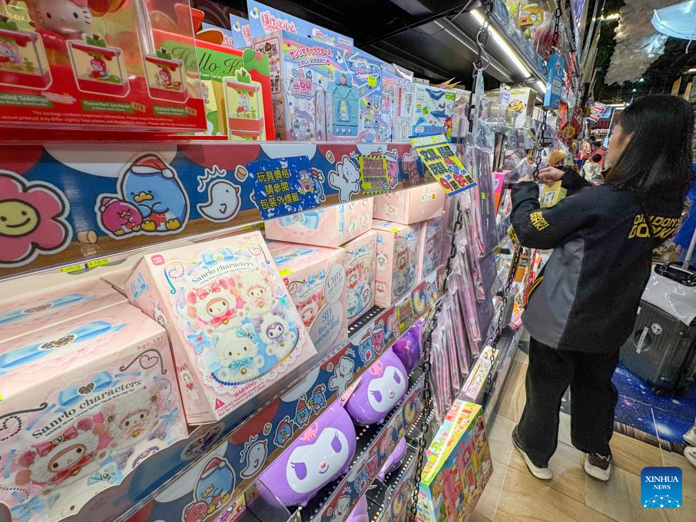This photo shows Sanrio-themed products at Guangzhou Moetch Cultural & Creative Co., Ltd. in Guangzhou, south China's Guangdong Province, Oct. 28, 2025.