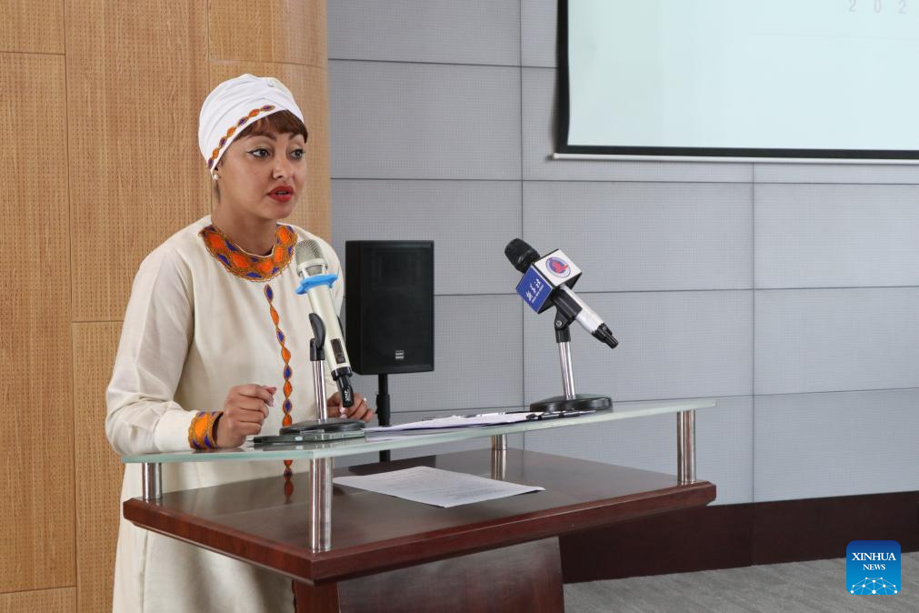 Hanan Ahmed, a local entrepreneur, speaks at the graduation ceremony of the Global Female Entrepreneurship Empowerment Program workshop in Addis Ababa, the capital of Ethiopia, on Dec. 20, 2025. (Xinhua/Liu Fangqiang)