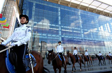 Mounted policewomen secure Summer Davos Mounted policewomen patrol outside the Dalian World Expo Center, the venue of the Annual Meeting of the New Champions 2009, or Summer Davos, in Dalian, Sept. 12, 2009.