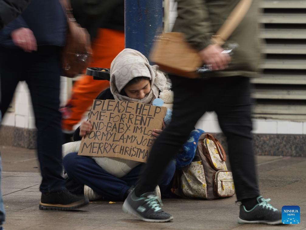 A homeless man seeks help on a street in New York City, the United States, on Dec. 22, 2025. (Xinhua/Zhang Fengguo)