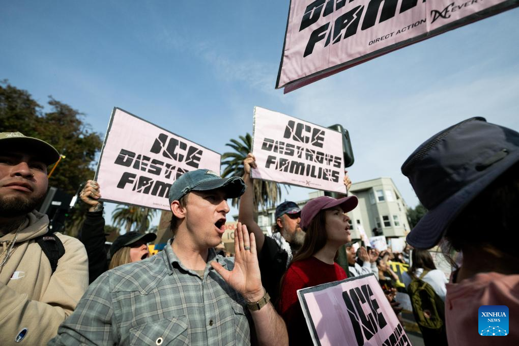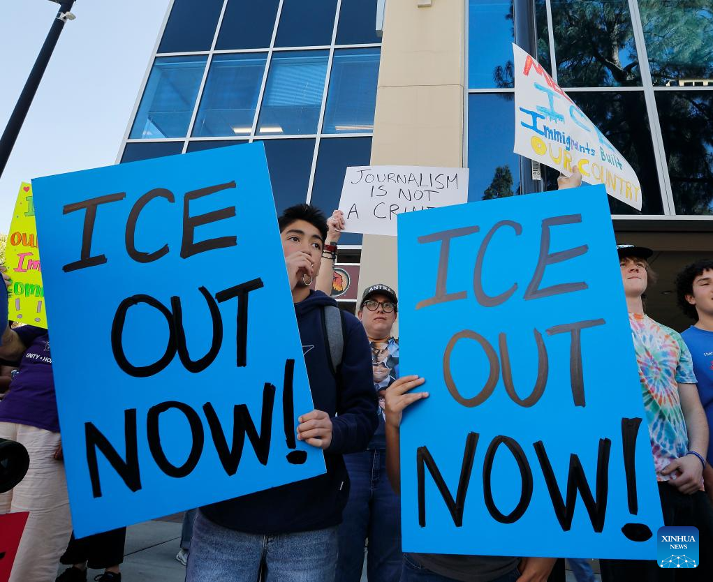 Rachel Elder, who attended a protest with her son, told Xinhua she was demonstrating against what she described as unlawful violence by ICE agents. "I'm here with my son because we are protesting the occupation of ICE and the unlawful violence, murder that the agents have committed against innocent protesters," she said.