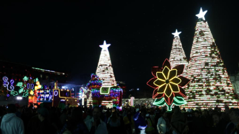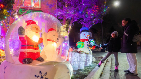 People look at Christmas-themed lights and decorations in Mississauga, Canada
