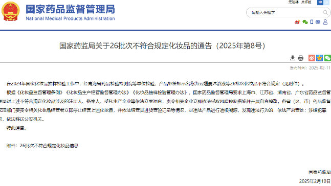 國家藥監(jiān)局關(guān)于26批次不符合規(guī)定化妝品的通告(2025年第8號)