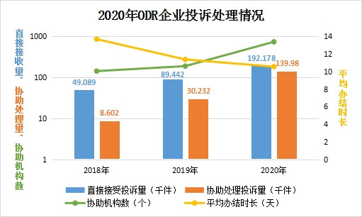 2020年,市場(chǎng)監(jiān)管部門大力推進(jìn)在線糾紛和解機(jī)制建設(shè),努力把消費(fèi)糾紛化解在源頭、解決在基層、和解在企業(yè)。全國(guó)12315平臺(tái)共發(fā)展ODR企業(yè)2.55萬(wàn)家,主動(dòng)與消費(fèi)者協(xié)商糾紛19.22萬(wàn)件,與傳統(tǒng)調(diào)解方式相比,和解率高出6.21個(gè)百分點(diǎn),平均處理時(shí)長(zhǎng)縮短7.76天,消費(fèi)者滿意度4.07分(滿分5分),ODR城市覆蓋率由25.60%增加到91.11%。與2019年相比,2020年ODR機(jī)制運(yùn)行質(zhì)量有了明顯提高,投訴處理量、辦理效率、和解成功率、消費(fèi)者滿意度等各方面均有明顯提升,維權(quán)效能日益突顯。
