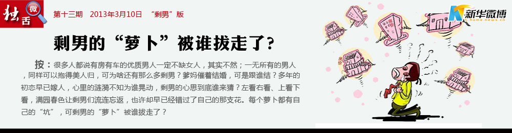 @稻草人:你嫁,或者不嫁人;你媽總在那里,忽悲忽喜;你剩,或者不剩下,青春總在那里,不來只去;你挑,或者不挑剔;貨就那么幾個(gè),不增只減;你認(rèn),或者不認(rèn)命;愛情總得忘記,不舍也棄;來剩男的懷里,或者,讓剩男住進(jìn)你心里。