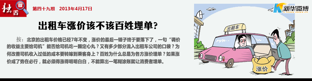 一粬:需考慮全國人民的感受 反對出粗車漲價,北京出租車漲價的理由居然是根據(jù)北京居民和工薪階層工資上漲幅度為理由,確實是特權利益階層短視經(jīng)不起推敲的謬見,北京是全體國家公民一生中最少去一次的城市,所有窗口行業(yè)的收費確實不只是一個城市的小事情,須思考全國人民的感受。