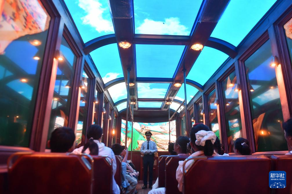 小学生在位于山东省青岛市中山路的数字电车里听解说员介绍。