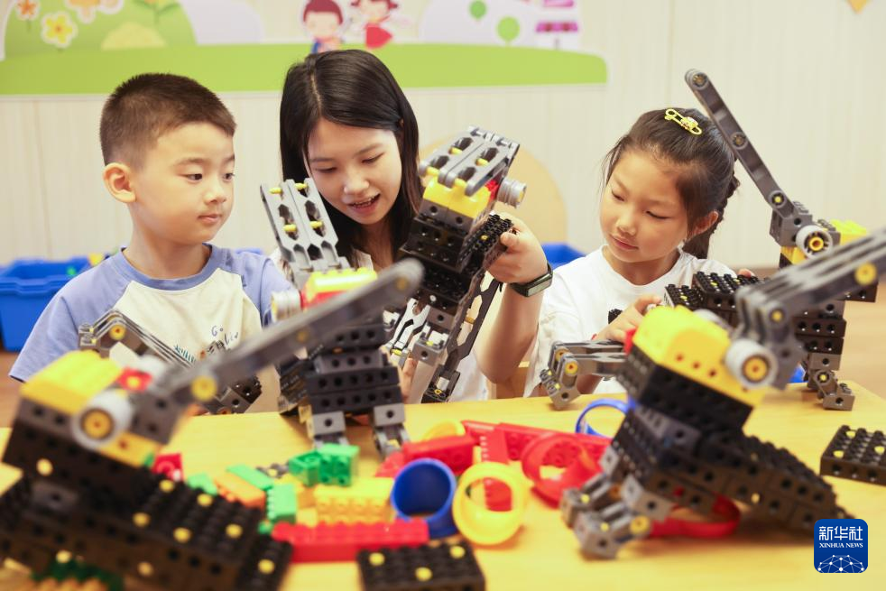在浙江省湖州市德清县乾元镇直街社区青少年宫,孩子在老师指导下组装积木。