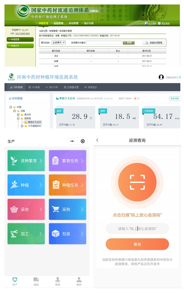 依托國家中藥材流通追溯體系、河南中藥材種植環(huán)境監(jiān)測系統(tǒng)、宛西制藥ERP信息系統(tǒng),企業(yè)建成中藥材及中成藥生產(chǎn)流通可追溯體系,實現(xiàn)從基地藥材、中藥飲片、生產(chǎn)過程、質量檢測、市場流通全流程的業(yè)務管理和質量溯源管理。通過機制創(chuàng)新、優(yōu)化流程,實現(xiàn)統(tǒng)一管理,滿足強化企業(yè)質量管控。