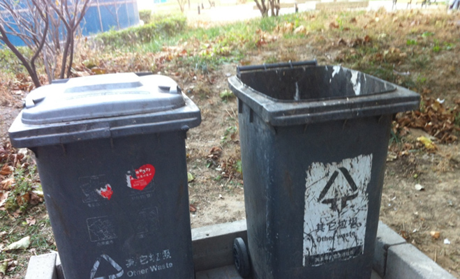 除了幾棵大樹之外,小區(qū)基本上沒有綠化,以前貌似種過綠草的地方,如今枯黃一片。垃圾桶早就已經破舊不堪,在殘留的文字上,依稀可見當時也曾嘗試過的垃圾分類。小區(qū)內沒有兒童休息場所、也沒有健身器材,只是設有幾個孤零零的座椅。