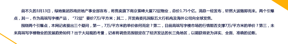 戴德梁行華東區(qū)寫字樓部董事沈潔表示,南京超甲級寫字樓的最高租金報價為5.5-6元/平方米/天,無法支持7萬/平方米的售價,所以“該價格不具有參考意義”。…[詳細]