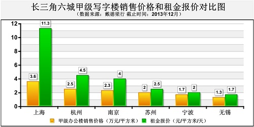 戴德梁行數據顯示,截止到2013年年底的一組數據:上海甲級寫字樓銷售均價3.6萬/平方米,南京為2.3萬/平方米,相差幅度達36.1%;上海甲級辦公樓租金報價11.3元/平方米/天,是南京(數值為:4.0元/平方米/天)的2.8倍。[詳細]