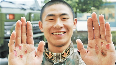 ??? 武警四川省總隊(duì)樂(lè)山市支隊(duì)官兵在嚴(yán)格訓(xùn)練中得到鍛煉。圖為2014年12月14日,戰(zhàn)士楊忠微笑著展示自己的訓(xùn)練“成果”。李華時(shí) 攝