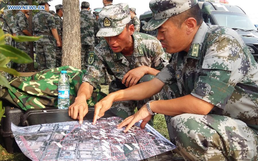 ??? Soldiers of National Nuclear Biochemical Emergency Rescue Team prepare to launch a rescue mission at the core area of explosion site in Tianjin, north China, Aug. 15, 2015. Death toll rose to 85 as of Friday night, including 21 firemen, from the massive warehouse explosions hitting north China's Tianjin City Wednesday night, the rescue headquarters said Saturday. Meanwhile, 721 others were hospitalized, including 25 critically wounded and 33 in serious condition. (Xinhua/Xu Zhuangzhi)