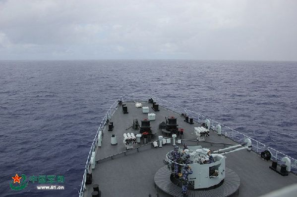????Soldiers prepare for the live-fire training in the Middle Pacific. The Chinese navy's training vessel "Zhenghe" carried out live-fire training in the Middle Pacific on October 23 on its way to South Korean port of Chinhae, the last stop of its ocean-going visit. The training vessel with 171 cadets from three academies of the PLA Navy on board, set sail from the port city of Dalian in northeast China on Sept. 23 and is scheduled to pay port calls to Vladivostok of Russia, Pearl Harbor of the U.S. and Chinhae of South Korea.