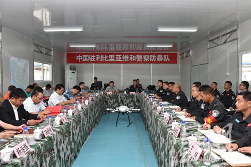 ??? 圖為中國(guó)第四支駐利比里亞維和警察防暴隊(duì)黨總支書記、政委徐曉偉(右一)主持召開聯(lián)創(chuàng)“三心”黨建座談會(huì)