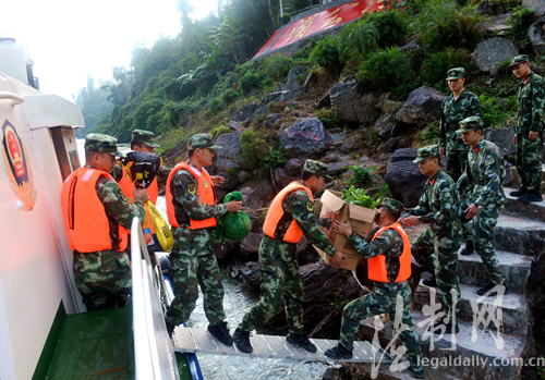 圖為官兵們將日用品用巡邏艇沿湄公河送到第一哨位執(zhí)勤點(diǎn)