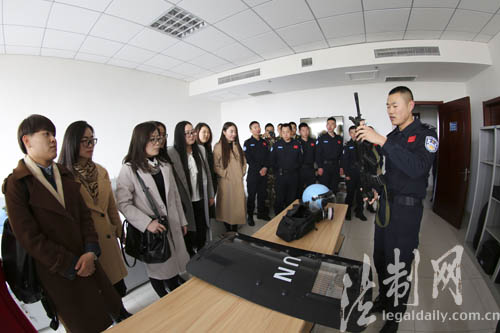 ????上午9時(shí),一輛掛著“相約藍(lán)盔、愛(ài)在警營(yíng)”紅色橫幅的大巴車緩緩駛?cè)刖?duì)營(yíng)區(qū)。一下車,姑娘們饒有興致地參觀了警隊(duì)內(nèi)務(wù)設(shè)置和裝備展示,現(xiàn)場(chǎng)觀看了藍(lán)盔方陣扣人心弦的戰(zhàn)術(shù)表演,隊(duì)員們氣吞萬(wàn)里的練兵激情、敢打必勝的過(guò)硬素質(zhì),一下子吸引了大家的眼光。在此之前,她們只是在心中默默仰慕那頂“藍(lán)色貝雷帽”,從電視上看到過(guò)威武帥氣的維和隊(duì)員。第一次如此近距離接觸,讓不少姑娘的心中蕩起層層漣漪。