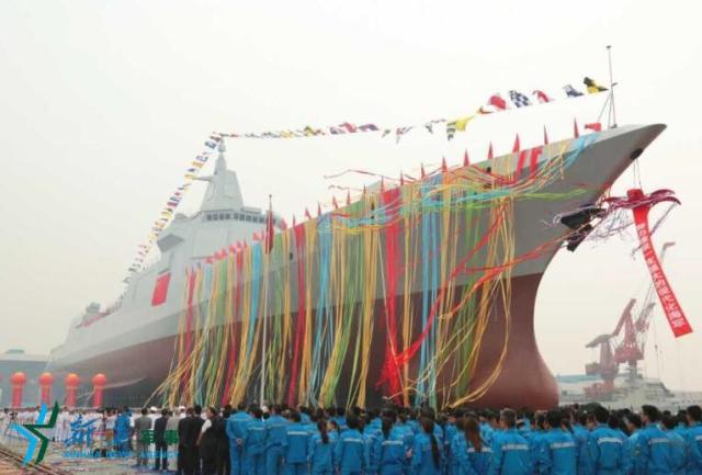 ?。箷r許,儀式開始,隨著儀式現(xiàn)場全體人員齊聲高唱的國歌聲,鮮艷的五星紅旗冉冉升起。剪彩后進行了“擲瓶禮”,一瓶香檳酒在艦艏摔碎,絢麗的彩帶從兩舷噴射而出,新型驅(qū)逐艦鳴響汽笛,全場響起熱烈掌聲。隨后,驅(qū)逐艦在拖曳牽引下緩緩移上浮箱后下水。