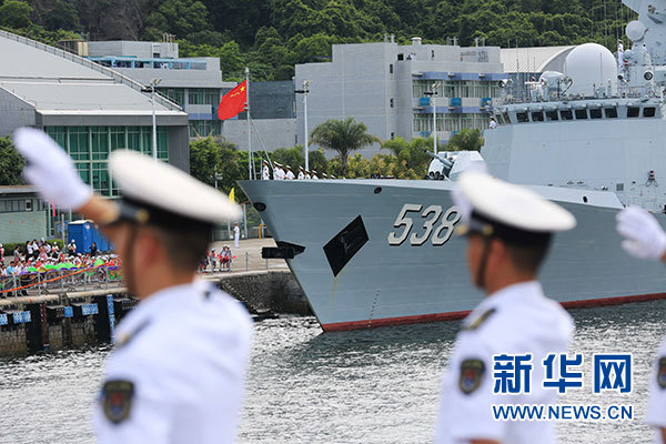 7月7日,海軍銀川艦駛?cè)胂愀郯捍薮a頭。當(dāng)日,正在執(zhí)行跨區(qū)機(jī)動(dòng)訓(xùn)練任務(wù)的中國(guó)人民解放軍海軍航母編隊(duì)抵達(dá)香港,參加香港回歸祖國(guó)暨中國(guó)人民解放軍進(jìn)駐香港20周年慶?;顒?dòng),受到香港特區(qū)政府和民眾熱烈歡迎。新華社記者 曾濤 攝
