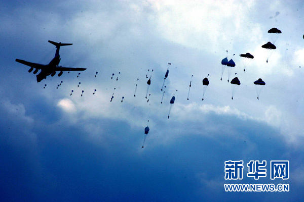2005年8月24日,參加“和平使命-2005”中俄聯(lián)合軍事演習(xí)第三階段兩棲登陸作戰(zhàn)實(shí)兵課目演練的中國空降兵部隊(duì)在實(shí)施傘降。新華社記者 查春明 攝