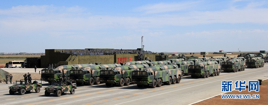 7月30日,慶祝中國(guó)人民解放軍建軍90周年閱兵在位于內(nèi)蒙古的朱日和訓(xùn)練基地舉行。中共中央總書(shū)記、國(guó)家主席、中央軍委主席習(xí)近平檢閱部隊(duì)并發(fā)表重要講話。這是核常兼?zhèn)鋵?dǎo)彈方隊(duì)。新華社記者 查春明 攝