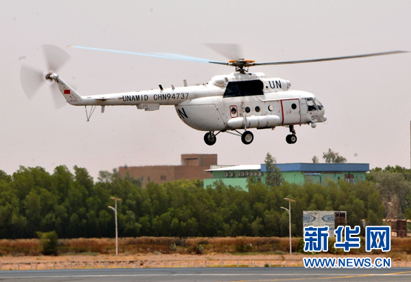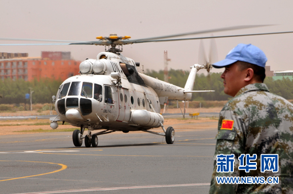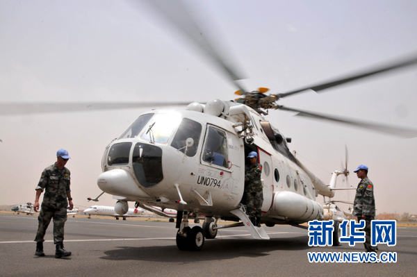 ?。吩拢常比?,中國首批維和直升機(jī)分隊(duì)在蘇丹喀土穆國際機(jī)場成功首飛。