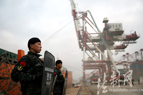 ????此次海上聯(lián)合反恐演練以阻止多名“涉恐分子”潛入港區(qū)及外輪企圖進(jìn)行恐怖活動(dòng)為背景,幾名“恐怖分子”駕車(chē)意圖混入油港區(qū)實(shí)施破壞,被識(shí)破后仍試圖強(qiáng)行進(jìn)入。與此同時(shí),前灣港集裝箱碼頭也發(fā)現(xiàn)幾名“涉恐分子”偽裝成船員,隨集裝箱貨輪進(jìn)入港區(qū)實(shí)施破壞行動(dòng),并在一艘即將離港的貨輪上劫持“人質(zhì)”,企圖逃離港區(qū)。面對(duì)如此復(fù)雜的局面,公安、邊檢、海關(guān)、國(guó)檢、港口等部門(mén)接到情報(bào)預(yù)警信息后,及時(shí)啟動(dòng)海上聯(lián)合反恐處突應(yīng)急預(yù)案,聯(lián)合反恐指揮部及時(shí)下達(dá)指令,參加演練單位立即行動(dòng),邊檢利劍突擊隊(duì)隊(duì)員迅速登輪控制“涉恐分子”,消防部門(mén)架設(shè)水槍撲滅引燃物品,海關(guān)、海事巡邏艇在集裝箱船舶周邊海域鋪設(shè)防油污圍欄,并收繳走私涉恐物資。成功處置險(xiǎn)情后,碼頭恢復(fù)生產(chǎn)作業(yè)。