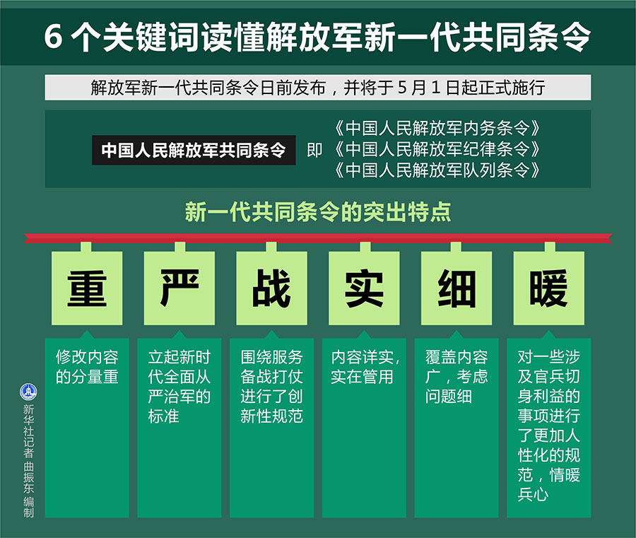 新華社北京4月15日電(記者黎云、劉濟美)解放軍新一代共同條令日前發(fā)布,并將于5月1日起正式施行。記者從中央軍委訓練管理部采訪獲悉,“重、嚴、戰(zhàn)、實、細、暖”6個關鍵詞,是新一代共同條令的突出特點。