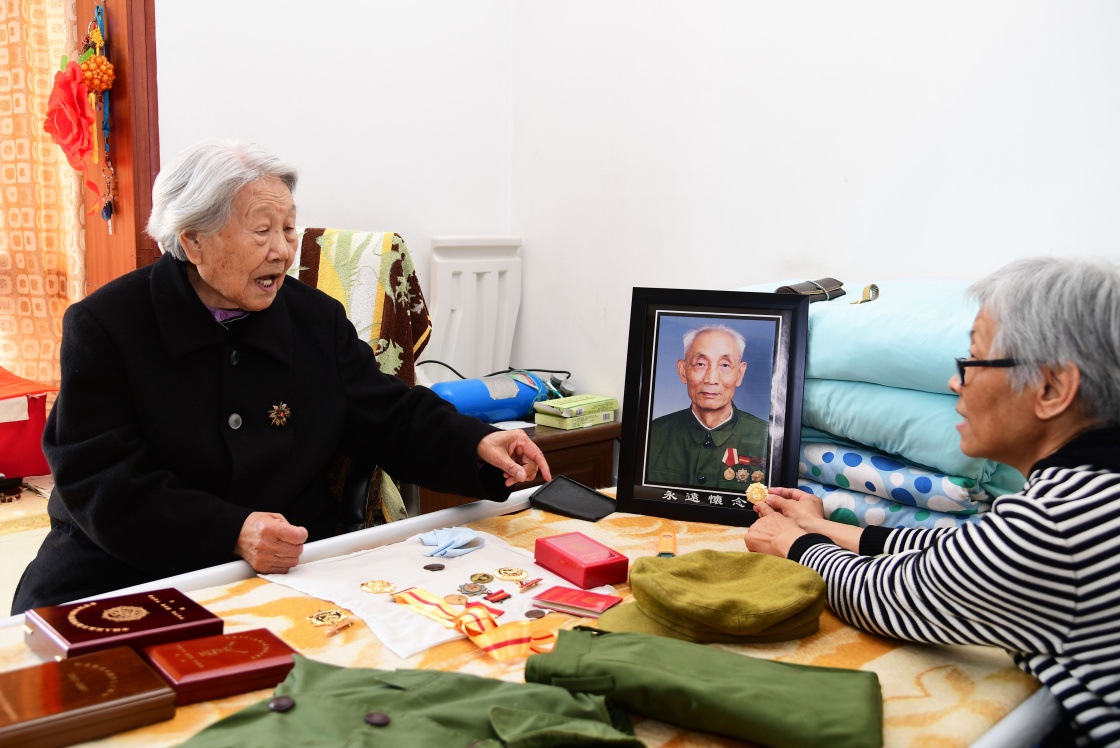 婁淑珍(左)與女兒一起整理周智夫獲得的榮譽章。新華社記者 張永進(jìn) 攝