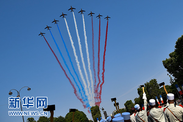 7月14日,在法國(guó)巴黎舉行的國(guó)慶閱兵儀式上,“法蘭西巡邏兵”飛行表演隊(duì)飛過(guò)香榭麗舍大街。新華社記者 陳益宸 攝