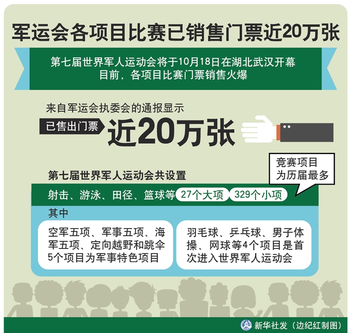 新華社武漢10月16日電(記者梁建強(qiáng))第七屆世界軍人運(yùn)動(dòng)會(huì)將于18日在湖北武漢開(kāi)幕。目前,各項(xiàng)目比賽門票銷售火爆。來(lái)自軍運(yùn)會(huì)執(zhí)委會(huì)的通報(bào)顯示,已售出門票近20萬(wàn)張。