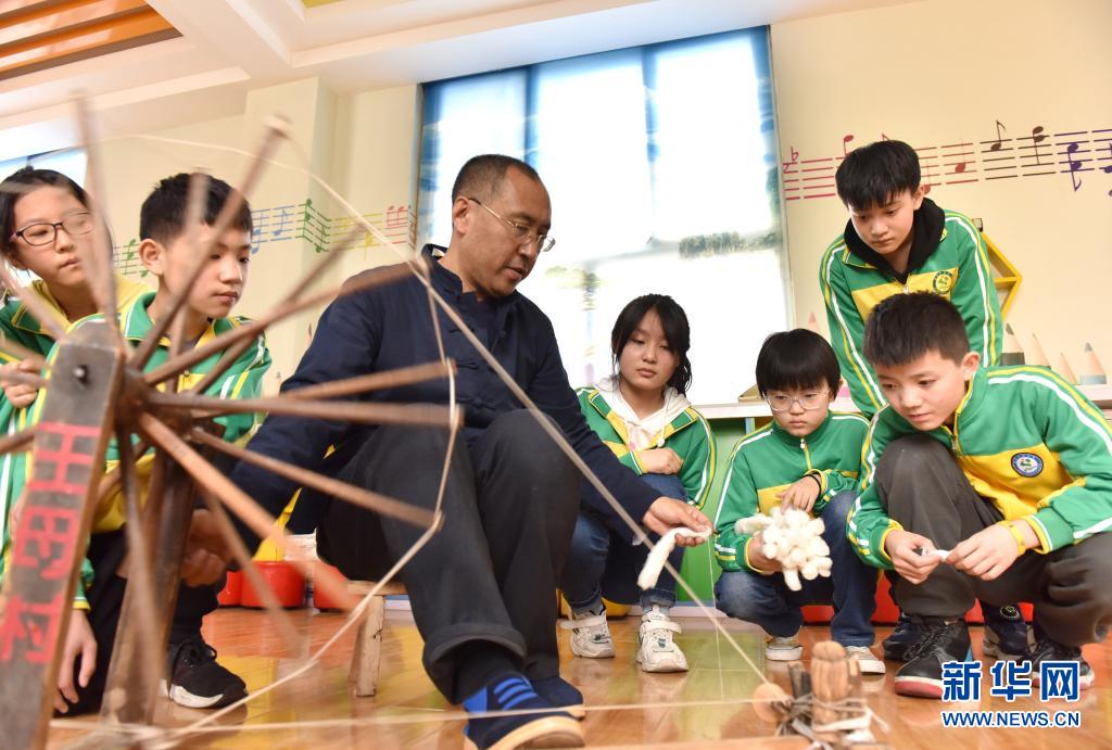4月7日,威縣土布紡織技藝傳承人高慶海在威縣第四小學(xué)向?qū)W生演示老粗布紡織技藝。近年來,河北省邢臺(tái)市威縣積極開展“非遺傳承進(jìn)校園”活動(dòng),將當(dāng)?shù)靥厣沁z項(xiàng)目引入學(xué)校課堂,讓學(xué)生近距離感受民間傳統(tǒng)技藝的魅力,促進(jìn)非遺文化的保護(hù)和傳承。新華社記者 朱旭東 攝