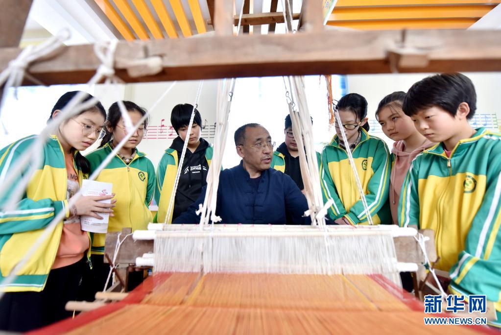 4月7日,威縣土布紡織技藝傳承人高慶海在威縣第四小學向學生講解老粗布紡織技藝。近年來,河北省邢臺市威縣積極開展“非遺傳承進校園”活動,將當地特色非遺項目引入學校課堂,讓學生近距離感受民間傳統(tǒng)技藝的魅力,促進非遺文化的保護和傳承。新華社記者 朱旭東 攝