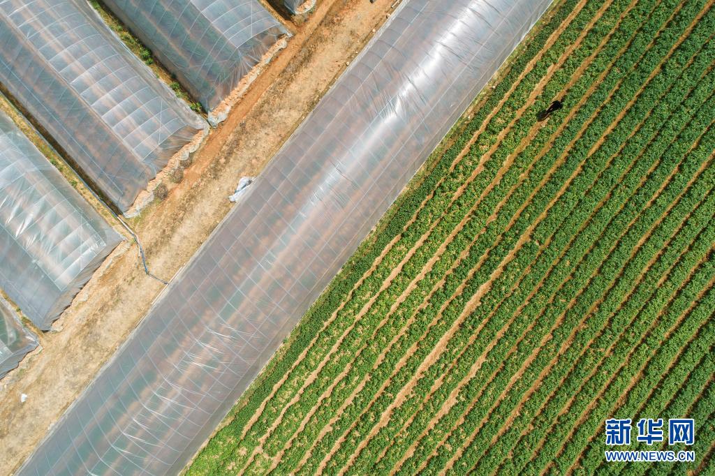 4月20日,在浙江省諸暨市楓橋鎮(zhèn)東山圩省級(jí)甘薯種苗繁育基地,農(nóng)民在田間除草(無(wú)人機(jī)照片)。