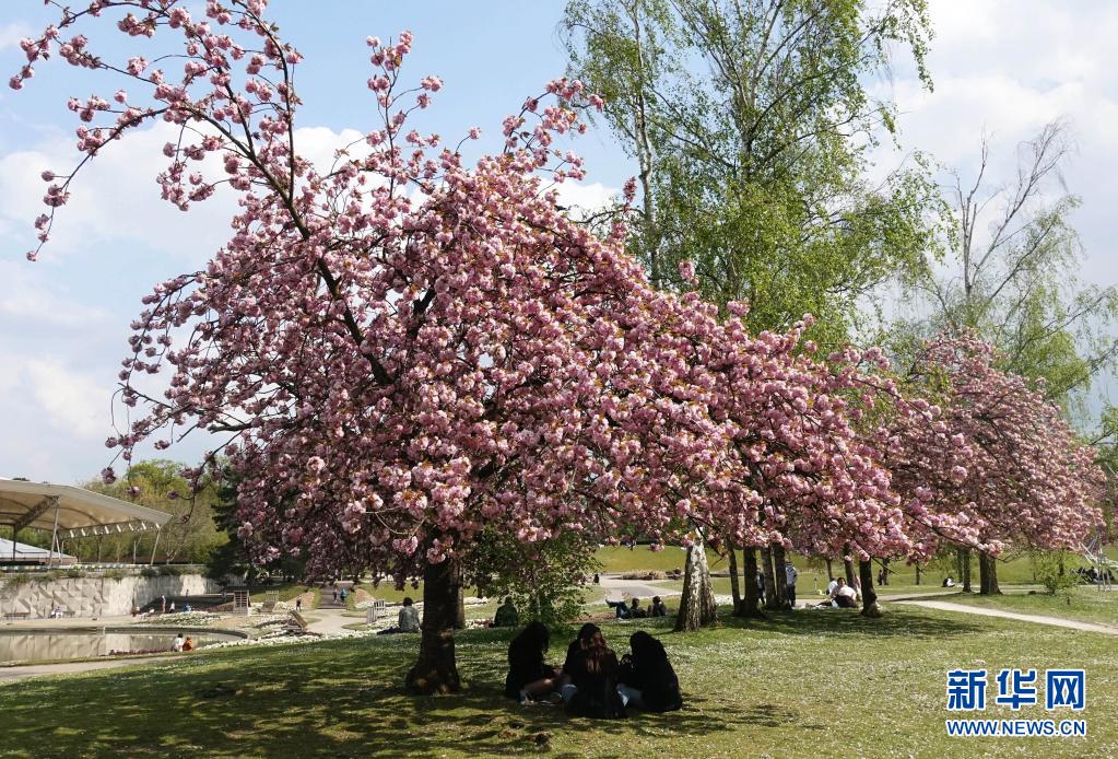 4月21日,人們?cè)诜▏?guó)巴黎一處公園的櫻花樹(shù)下休閑。
