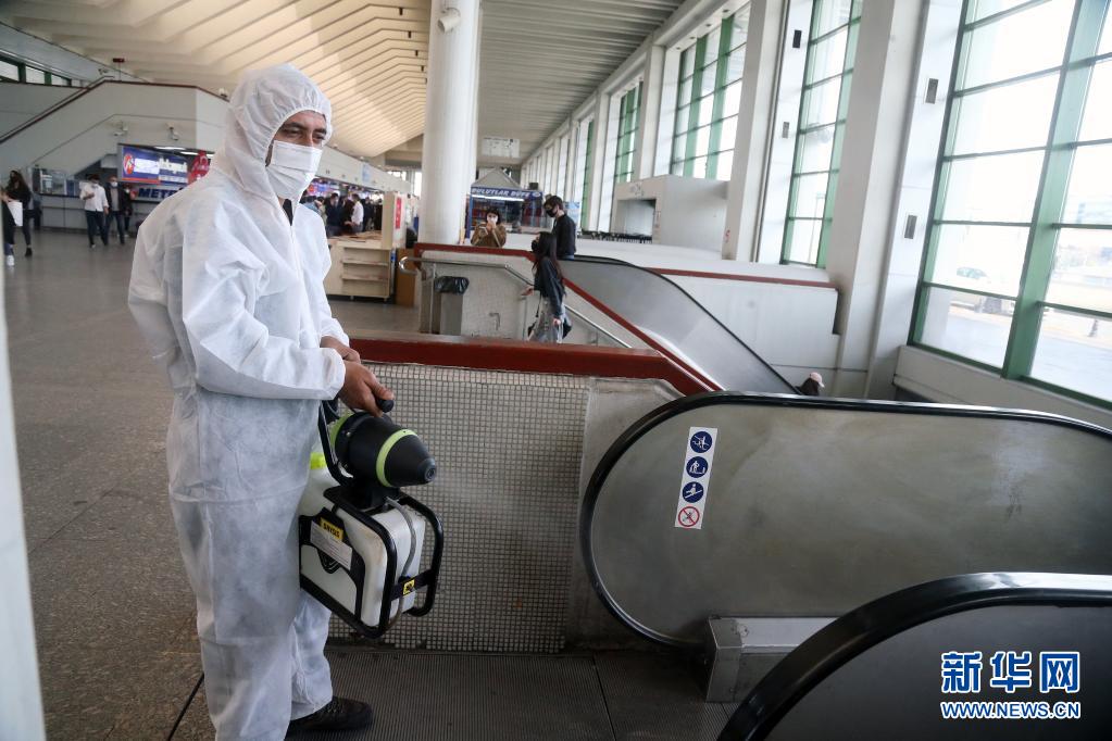 4月29日禁令實(shí)施前,一名身穿防護(hù)服的清潔工人在土耳其安卡拉的公共汽車(chē)站消毒。