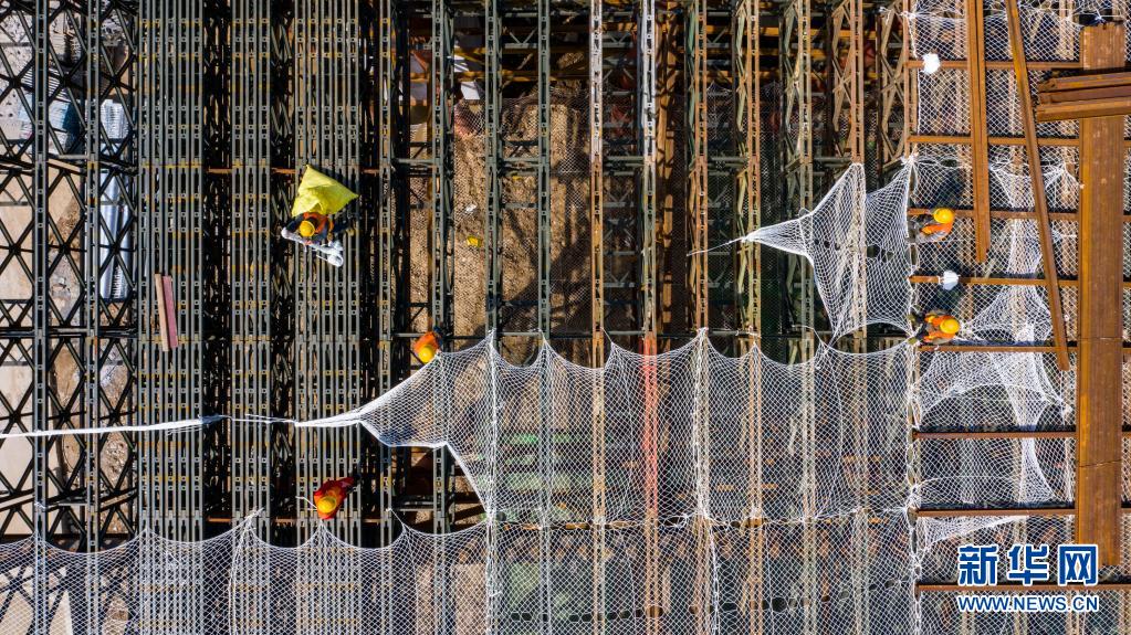 5月1日,在湖北襄陽內(nèi)環(huán)線項(xiàng)目跨襄北編組站大橋施工現(xiàn)場(chǎng),中鐵十一局建設(shè)者在進(jìn)行安全防護(hù)網(wǎng)掛設(shè)施工(無人機(jī)照片)。