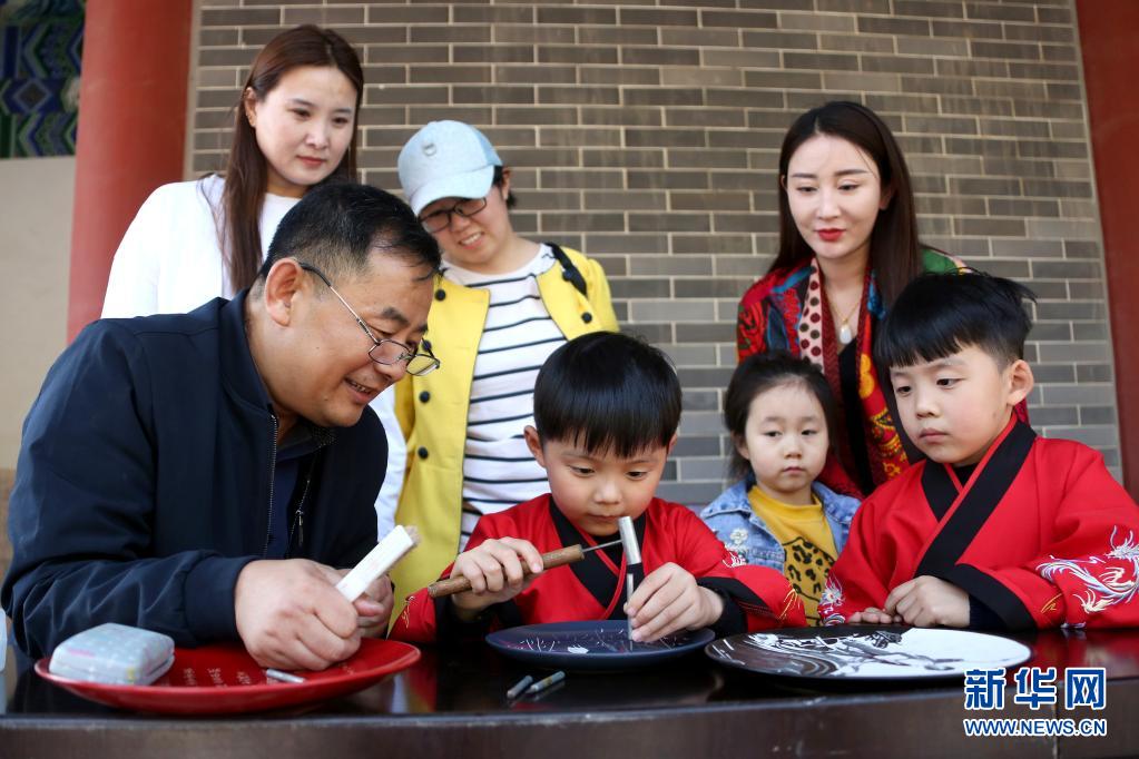 5月1日,在山東省棗莊市孟莊鎮(zhèn)境內(nèi)的龜山風(fēng)景區(qū),民間藝人胡安同(前左一)向小朋友傳授非遺刻瓷技藝。