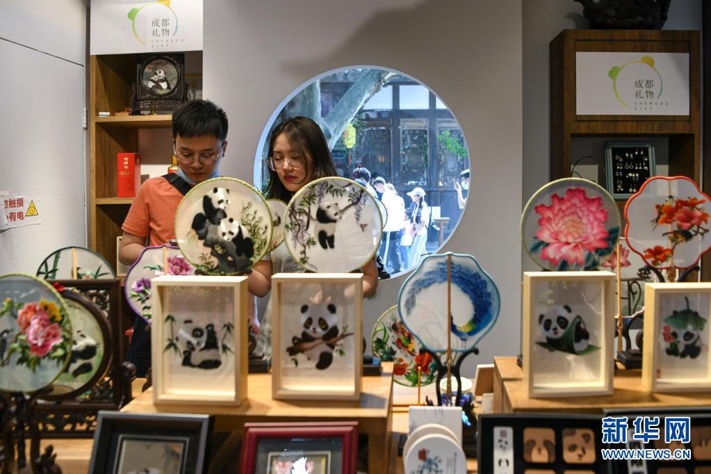 5月1日,游客在四川省成都市寬窄巷子景區(qū)的一家商店選購(gòu)蜀繡產(chǎn)品。