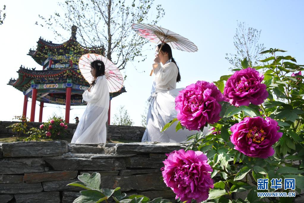 5月1日,兩名女孩身著漢服在牡丹園內(nèi)穿行。
