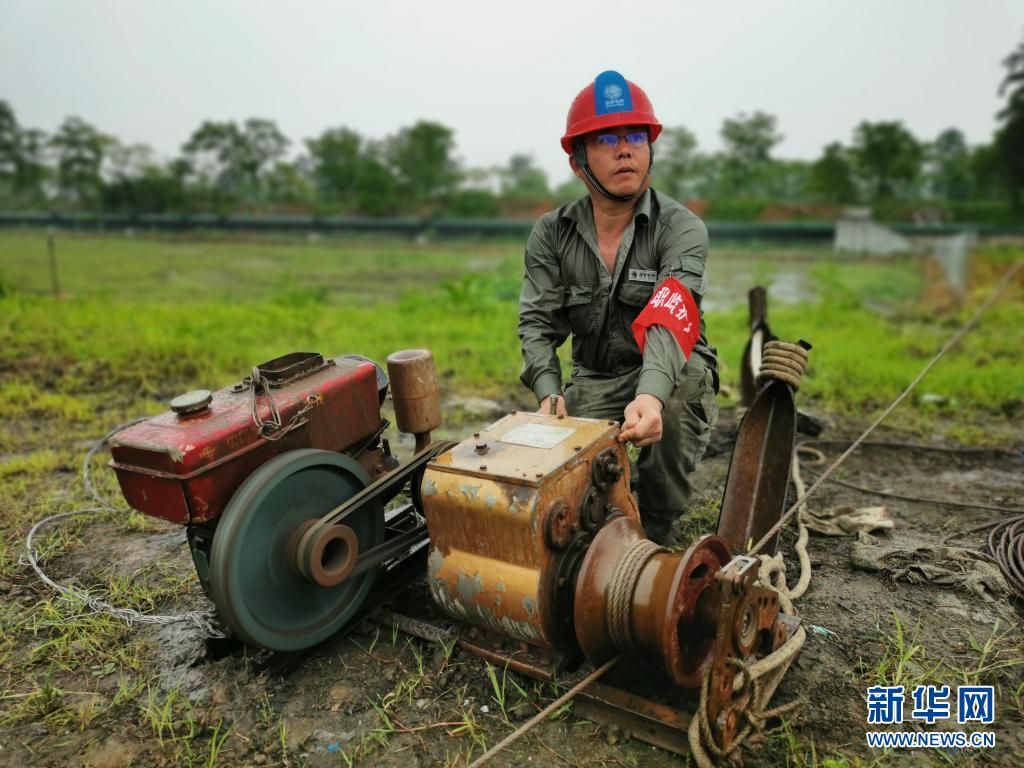 “跑山電工”黨員服務(wù)隊隊員操作機(jī)動絞磨牽引導(dǎo)線(5月3日攝)。