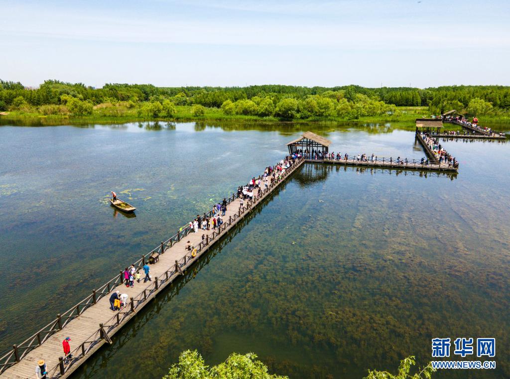 5月2日,游客在江蘇省泰州市姜堰區(qū)溱湖國家濕地公園棧道上游覽(無人機(jī)照片)。新華社發(fā)(顧繼紅 攝)
