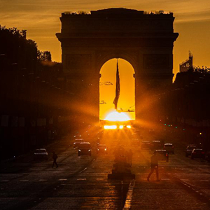 這是5月8日在法國巴黎香榭麗舍大街拍攝的凱旋門落日景象。