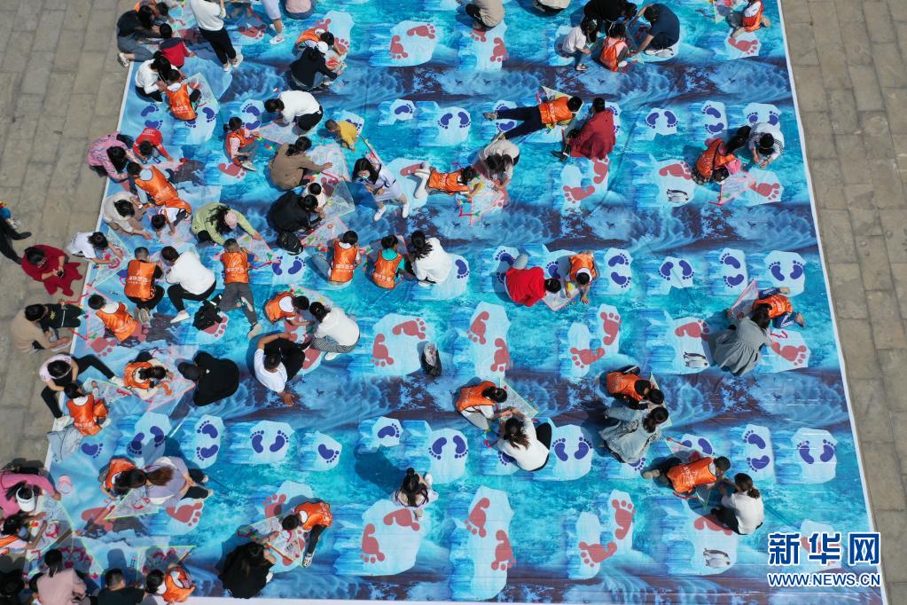 5月9日,在河北省新河縣南湖公園,孩子們跟媽媽一起繪制風(fēng)箏(無人機(jī)照片)。