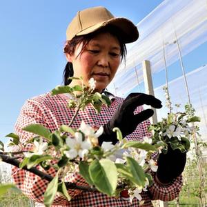 5月9日,在甘肅省平?jīng)鍪徐o寧縣城川鎮(zhèn)一蘋(píng)果有機(jī)示范園里,果農(nóng)在疏花。
