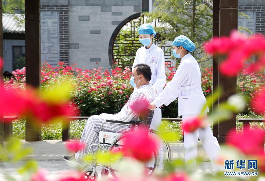 5月11日,河北省邢臺市南和區(qū)人民醫(yī)院護士在院區(qū)陪伴患者,將關懷融入日常護理。