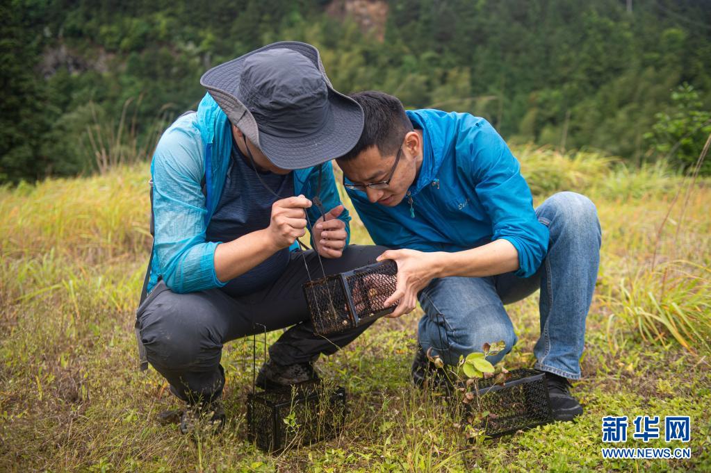 5月12日,南京環(huán)境科學(xué)研究所研究員雍凡(左)與參與此次調(diào)查的助理劉煜坤觀察誘捕籠內(nèi)的動物活動痕跡。